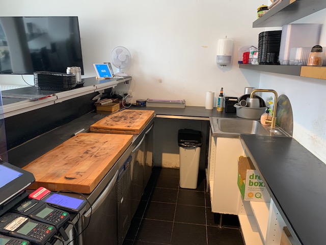 Forretningen er iøjenfaldende, og ligger med sin store glasfacade ud til krydset. Og størrelsen giver mulighed for meget mere, og måske også andre koncepter. Produktionen foregår i fronten, og her er et mindre køkken bagerst i forretningen, med lager, køl og frys, og så er der en dejlig stor kælder til opmagasinering. Konceptet er Sushi, og kan selvfølgeligt fortsættes. Men andre “kolde” koncepter er også mulige.